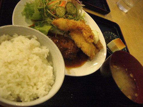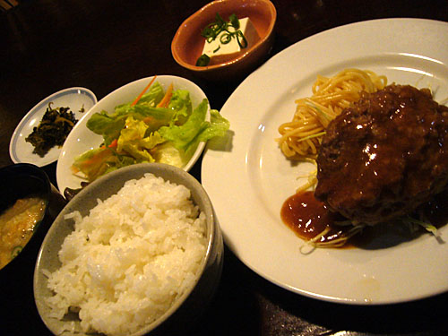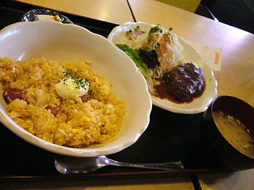 チャーハンバーグ定食700円。駄洒落めいたネーミングに騙されることなかれ、濃すぎず薄すぎず、食べやすい味付けのチャーハンにハンバーグ、豆腐がセットになったボリュームも大満足。スプーンが付いてくるので、読書しながらでも食べやすく一人の時なんかいいですよ。<2009.10.22追記>