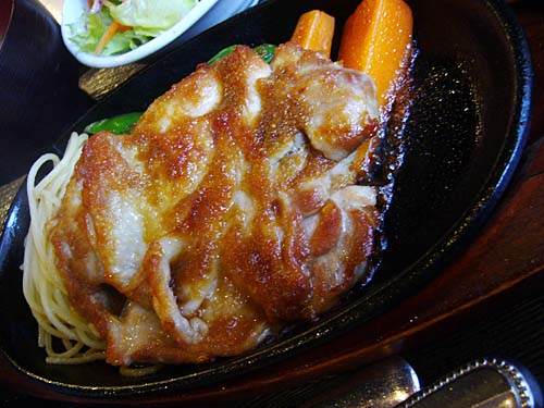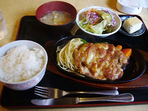 チキンステーキ定食700円。これは美味い。ジュージュー音をたてているのが食欲をそそります。ステーキソースはけっこう甘く、ニンジンも食べやすい。肉は柔らかく、ナイフで簡単に切れます。700円で少しリッチな気分に浸れる一品です。<2009.7.3追記>
